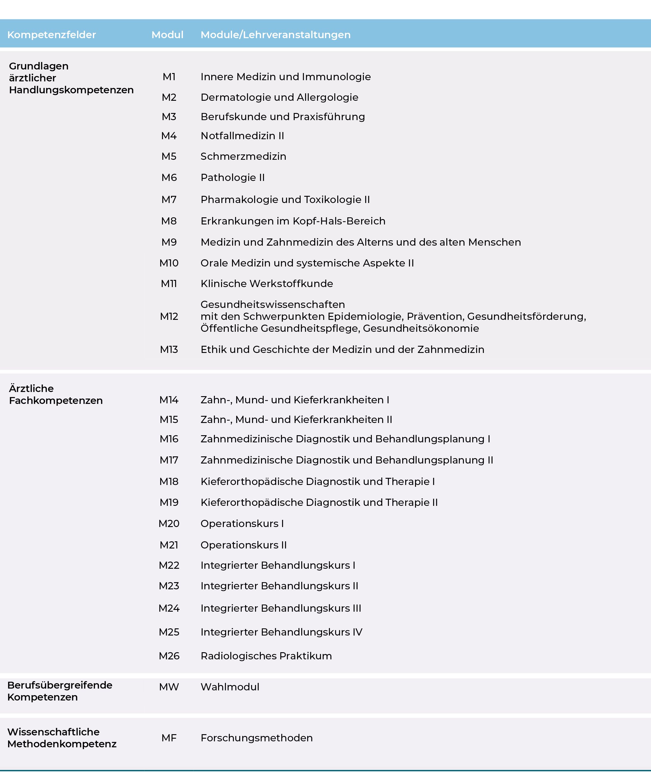 Das 7. bis 10. Semester vermittelt Grundlagen der ärztlichen Handlungskompetenz, Ärztliche Fachkompetenzen, Berufsübergreifende Kompetenzen sowie Wissenschaftliche Methodenkompetenz. Mit einer OSCE-Prüfung (OSCE – objective structured clinical examination) wird die ärztliche Handlungskompetenz nachgewiesen und der Übergang zu den Modulen der ärztlichen Fachkompetenz vorbereitet. Durch solche praktischen Prüfungsformate verbessern die angehenden Zahnmediziner:innen ihre Problemlösungsfähigkeiten.