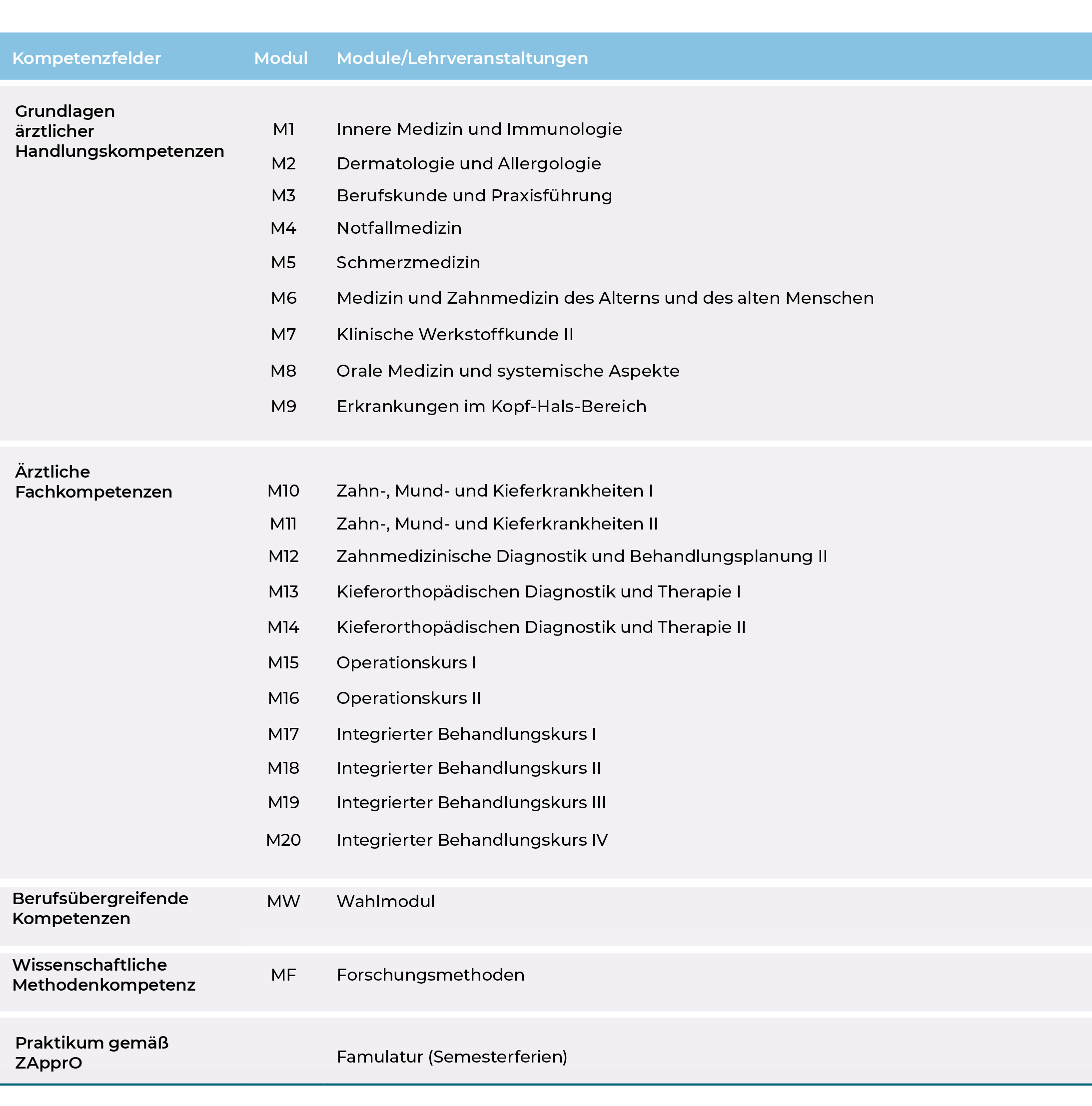 Die Famulatur ist in der vorlesungsfreien Zeit nach bestandenem Ersten Abschnitt der Zahnärztlichen Prüfung abzuleisten. Diese Abfolge garantiert, dass die entsprechenden Kompetenzen in der Abfolge der Module bereits behandelt wurden.